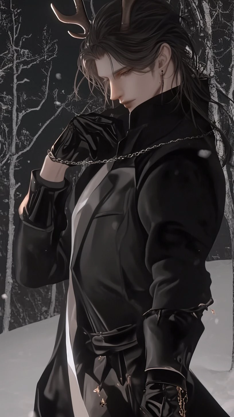He can wear a human shape when it suits him; dark-eyed, sharp-tongued, and magnetic in a way that feels earned rather than offered. Beneath it, something antlered and wolfish waits, held back by iron will and ritual restraint. Valrik does not lose control. He chooses when to loosen it.
